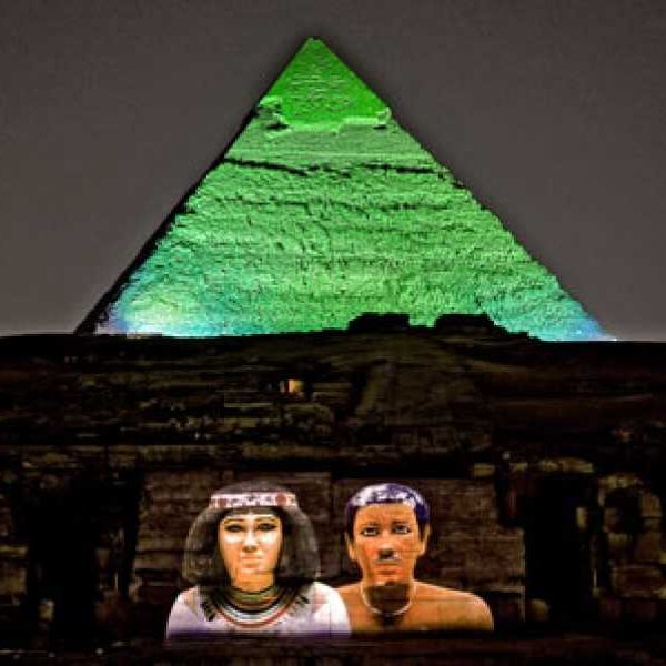 As night falls, the Giza Pyramids come alive with a breathtaking sound and light show, narrating the story of ancient Egypt through dramatic lights and powerful storytelling.
